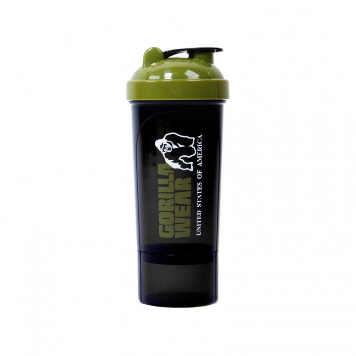 Kompakt shaker i sort/grønn farge fra Gorilla Wear med separat oppbevaringsbeholder!