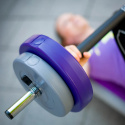 130 cm. vektstang, i stål trukket med gummi, på 1,5 kg. med 2 stk. fjærlåser. 6 stk. plastbelagte vektskiver (2 x 1,25 kg, 2 x 2,5 kg og 2x5 kg).