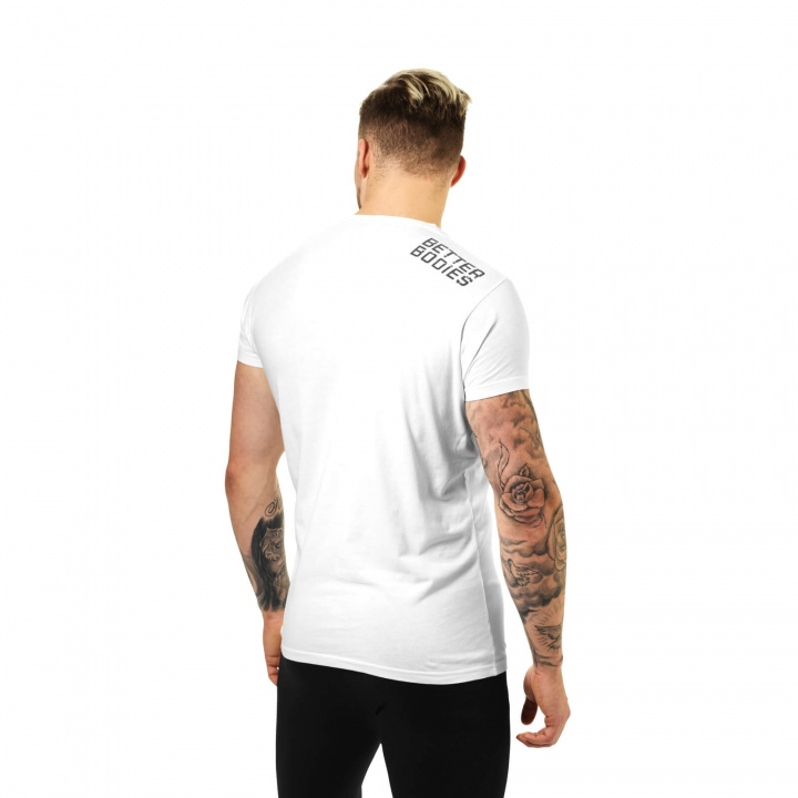 Elegant T-skjorte med Better Bodies-trykk på framsiden og på høyre skulder, samt emblem på venstre arm.