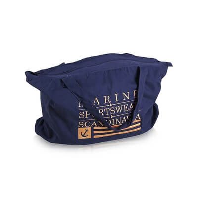 En marineblå meget romslig og praktisk strandveske fra Marine med glidelåsåpning, klassiske stropper og en elegant logo i kontrastfarge og på innsiden av vesken er en mindre lomme for oppbevaring av små eiendeler.