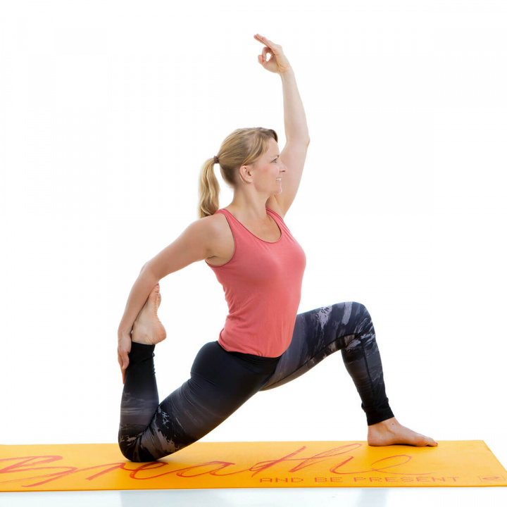 Gul yogamatte med orange trykk. Breathe and be Present!