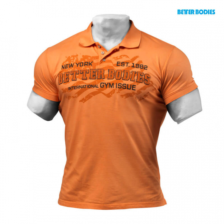 Fin oransje T-skjorte fra Better Bodies med en mandig, tettsittende passform og klassisk krage med metallknapper.
