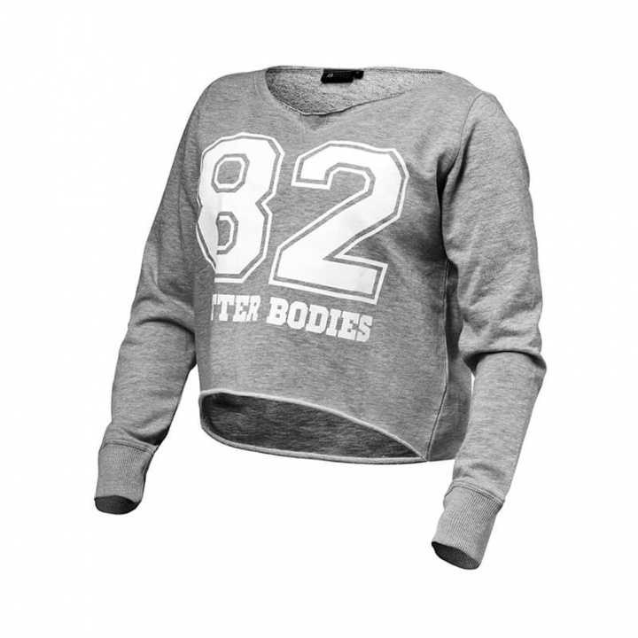 En grå topp i kortere modell fra Better Bodies laget i et amerikansk, mykt fleece-materiale med rå kant nederst. Har blitt designet med rund hals og ribbekanter på armene i bomull/lycra, og kan fint brukes både ved fysisk aktivitet og i mer avslappede situasjoner.