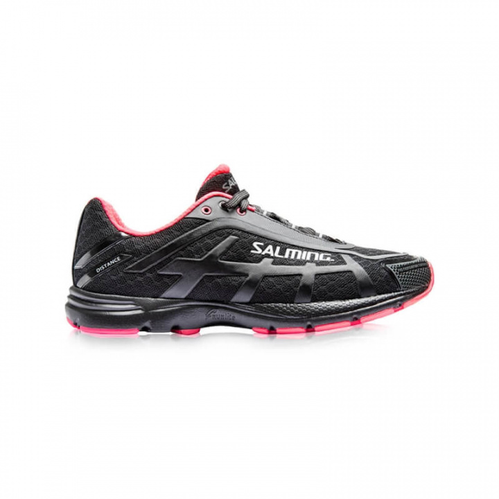 En sort og rosa distansesko fra Salming for kvinner som fremmer og oppmuntrer fotens mest naturlige bevegelsesmønstre og levere dertil både høy komfort og god bakkekontakt.
