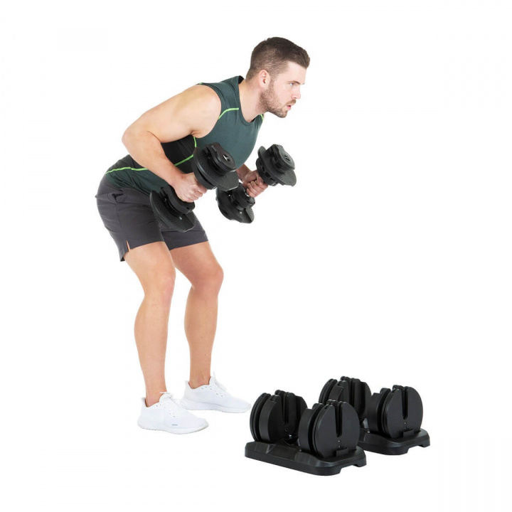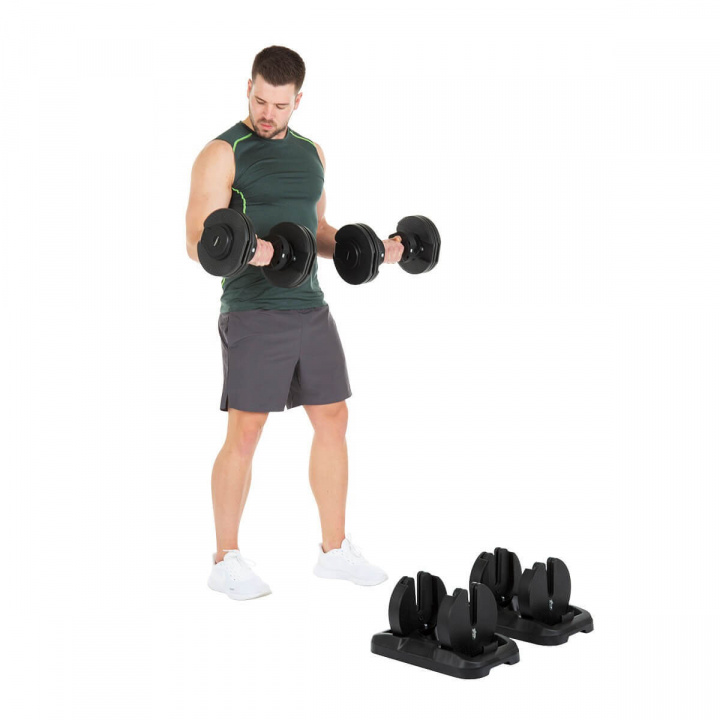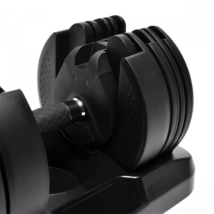 Dette justerbare manualsettet har 2 basestasjoner med 10 vekter hver som genererer 16 forskjellige vekstalternativer. Det gummierte håndtaket gir deg nødvendig grep og komfort under trening. Takket være den smarte rotasjonsmekanismen hører irriterende veksling av vektplater til fortiden. I tillegg er det enkelt å rengjøre ettersom alle vekter alltid er på plass. I stedet for mange individuelle manualer eller individuelle vektplater, har du med Hammers Dumbbell Beast en perfekt alt-i-ett-løsning og sparer dermed mye plass.