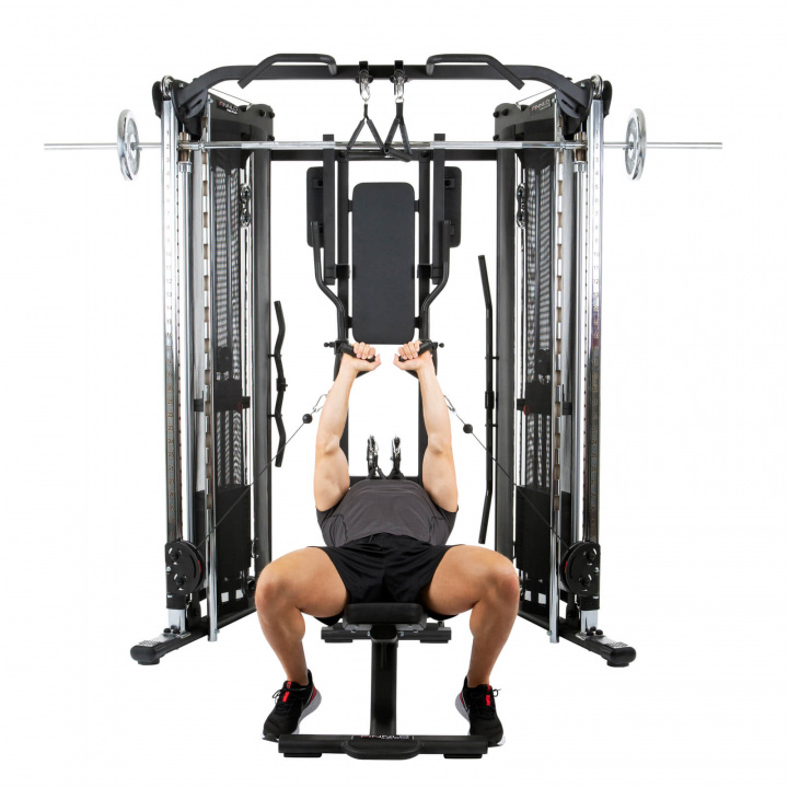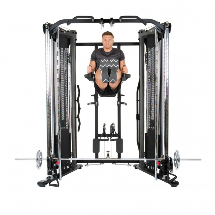 Autark 10.0 inkluderer både doble trekkstasjoner og integrert vektstangsmed. Rett og slett en kombinert smith-maskin og kompakt cablecross. Multigymet har også dipstasjon, armlener for magetrening og pull-up bar. En justerbar vektbenk følger også med. Autark 10.0 tilbyr omfattende tilbehør som vektstang, latstang, curlbar og en fotholder for bedre grep under mageøvelser. Høykvalitetslagrene i remskivene gir bevegelsesfrihet og de bevegelige trinsene på trekkstasjonene muliggjør styrketrening i ulike vinkler for variert stimulering.