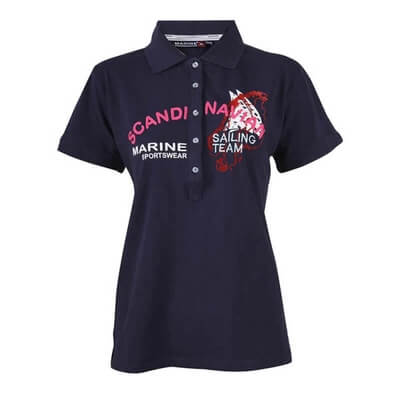 Mørkeblå piquéskjorte for dame med flott grafikk i Marine Sailing Team-stil.