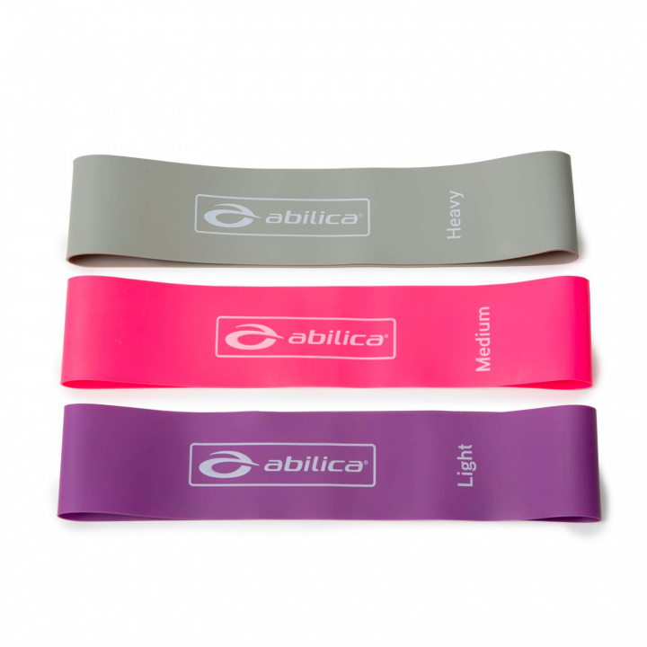 Et sett fra Abilica bestående av 3 gummibånd med forskjellige motstandsstyrker (4-15 kg, 7-25 kg og 9-34 kg).