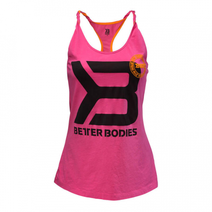 En stilren, rosa topp fra Better Bodies med stor logo på framsiden og tvinnede skulderbånd som har fått en herlig, løs passform og er utstyrt med doble sømmer ved halsutringingen og ermehullene.