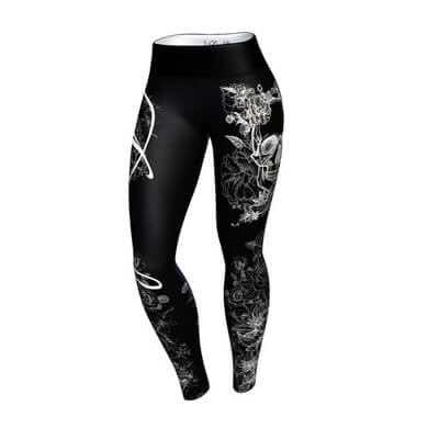 Et par stilige sorte kjører tights fra Anarchy Apparel i utsøkt skandinavisk design med kontrasterende mønster av hodeskaller og blomster.
