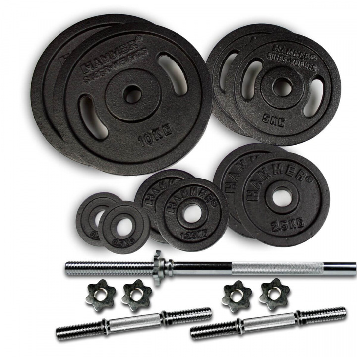 Et vektstang- og manualsett fra Hammer som inneholder 10 stk vektskiver, 1 stk vektstang, 2 stk manualstenger og 4 stk sikkerhetslåser.