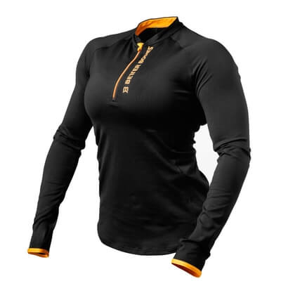 Svart genser fra Better Bodies med en diskret oransje logo og oransje glidelås, samt at den er utstyrt med tommelhull nederst på ermet. Laget i et fleksibelt polyester- og elastanmateriale som puster og gir en herlig passform.