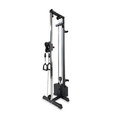 Denne opptrekksstasjonen har et vektmagasin på hele 80 kg. Vektplatene er laget av overflatebehandlet stål og ikke sement med plastdeksel slik billigere maskiner har.